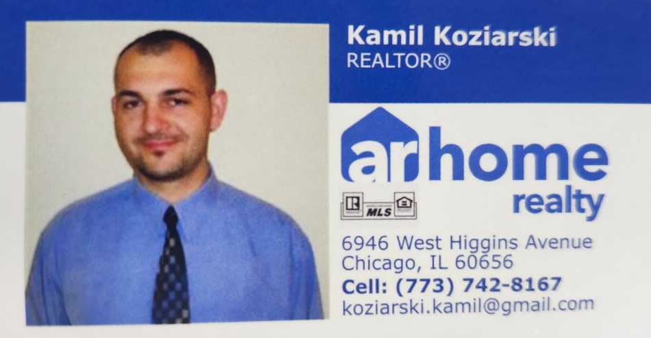 KAMIL KOZIARSKI Real Estate Broker. KUPNO I SPRZEDAŻ NIERUCHOMOŚCI. Ponad 10 lat doswiadczenia, darmowa wycena i niskie komisowe od sprzedazy. Domy, mieszkania, dzialki. Illinois, Floryda. 773-742-8167 arhome realty 6946 W. Higgins Ave, Chicago, IL 60656.