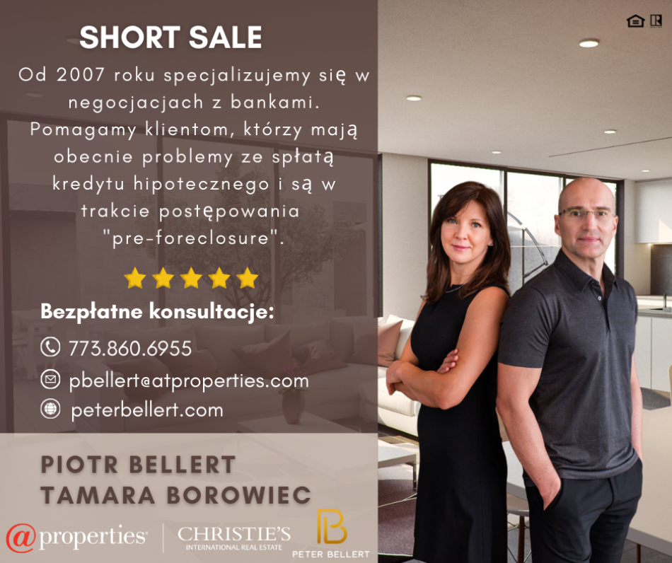 Sprzedaj z nami swój Dom. Od 2007 roku specjalizujemy się w negocjacjach z bankami. Pomagamy klientom, którzy maja obecnie problemy ze spłatą kredytu hipotecznego i są w trakcie postępowania "pre-foreclosure". Współpracujemy z pożyczkodawcami, doświadczonymi prawnikami, inwestorami i kupującymi, aby pomóc właścicielom nieruchomości w sprzedaży ich domów / mieszkań w drodze procesu "short sale". Nasze doświadczenie i wiedza pozwalają naszym klientom czuć się bezpiecznie i pewnie. Zapraszamy do współpracy. Piotr Bellert i Tamara Borowiec | @properties | pbellert@atproperties.com | 773-860-6955 | bellerthomes.com