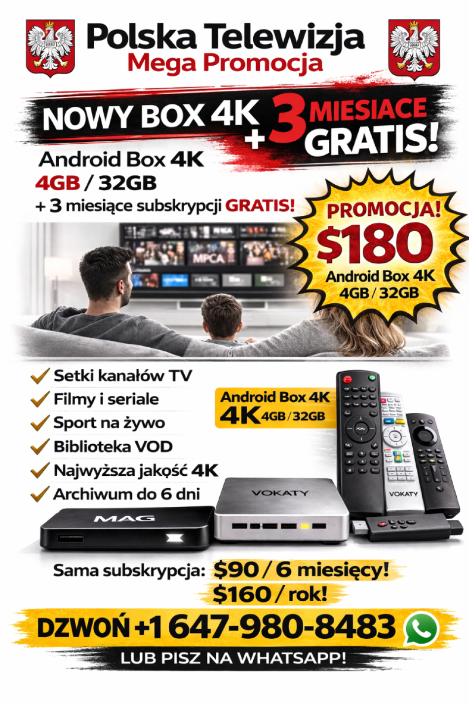 POLSKA TELEWIZJA–MEGA PROMOCJA! NOWY BOX 4K + 3 MIESIĄCE GRATIS TYLKO $180! Subskrypcja: $90/6mies., $160/rok. +1 647-980-8483